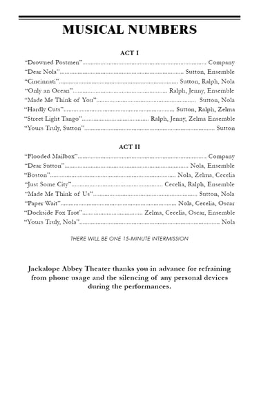 I took the illustration and applied it to designing the first few pages of a playbill to explore types of book layouts. This was an interesting process because, while there are some sections found in almost every playbill, there were more inconsistencies than I anticipated. Some were stylistic choices, but many were the result of needing to convey different information. For example, a playbill for a musical with a large orchestra accompaniment is going to need different sections than a Shakespearean production.