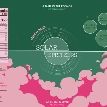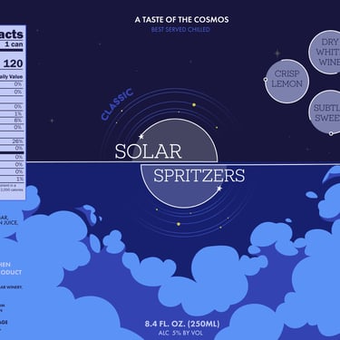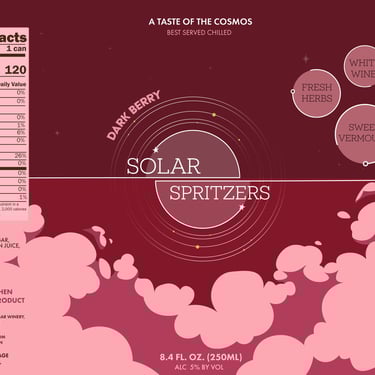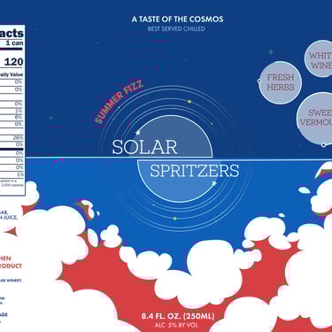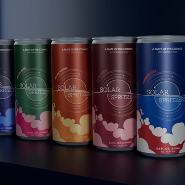 Solar Spritzers is a wine spritzer brand designed to appeal to a young adult audience, using fruity flavors paired with clean colorful, astronomy themed visuals to catch the eye and spark curiosity.